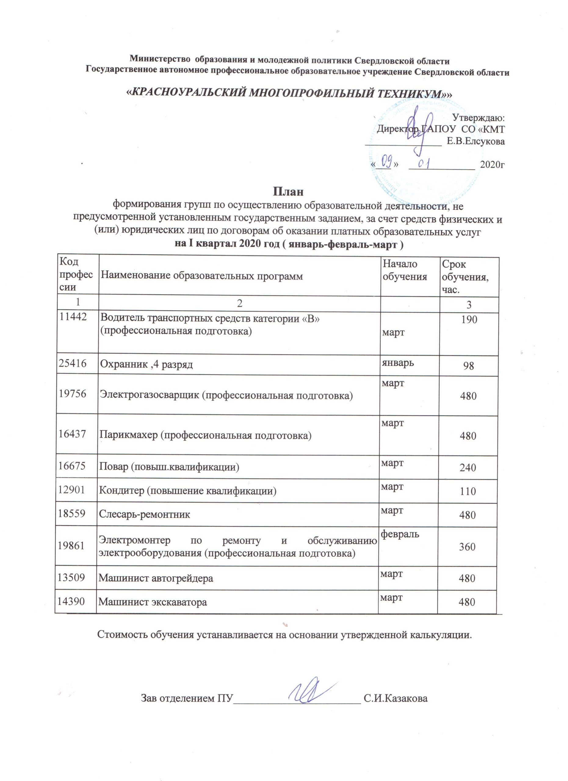 - План формирования групп по осуществлению Образовательной деятельности, не предусмотренной установленным государственным заданием, за счёт средств физических или юридических лиц по договорам об оказании платных образовательных услуг на 1 квартал 2020 год (январь, февраль, март)
